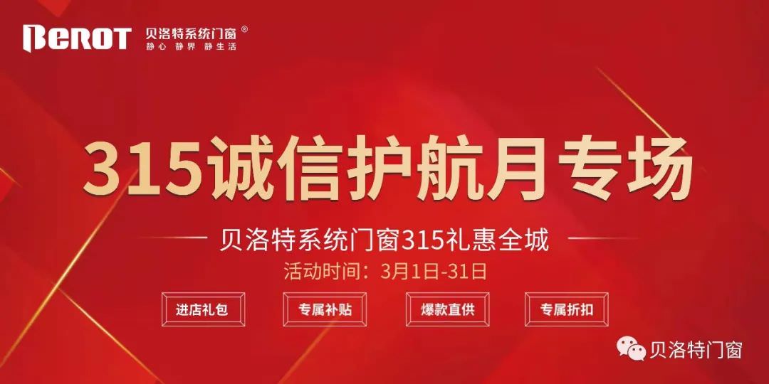 3月15日是國際消費者權(quán)益日,貝洛特系統(tǒng)門窗應(yīng)消費者需求,于3月1日至3月31日開展“誠信315·誠信護航·禮惠全城”活動,以答謝消費者長期以來對貝洛特系統(tǒng)門窗的信賴與厚愛。本活動全國同步開展,恭迎新老顧客進店選購。